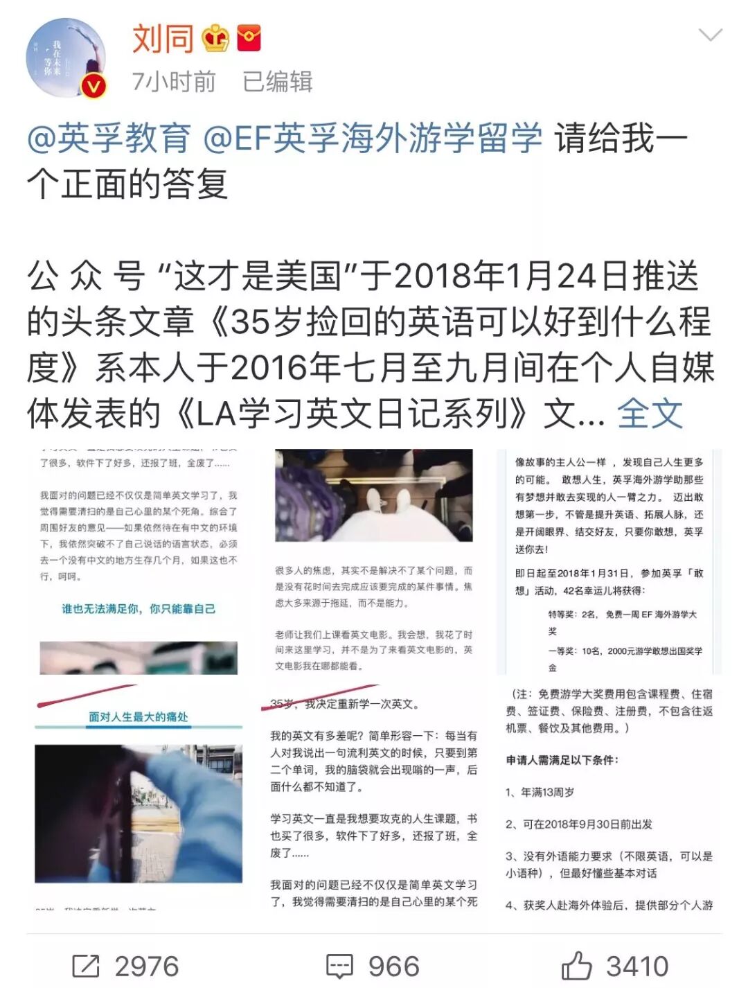 1月24日下午,知名作家刘同发布了一篇维权文章——《英孚教育,请尊重版权!请给我一个正面回复!》,点名批评英孚教育,在一年多的时间内多次拆分合并他的留学日记,用作广告宣传,误导学生报名。