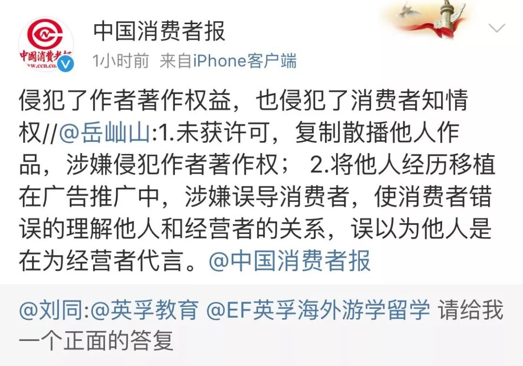 刘同说,这等于英孚利用他的影响力,利用他大量的粉丝群,起到宣传的作用。未征得他的同意,就拿作家的文章做软文,侵犯了版权,侵犯了名誉,更是对普通消费者的误导。