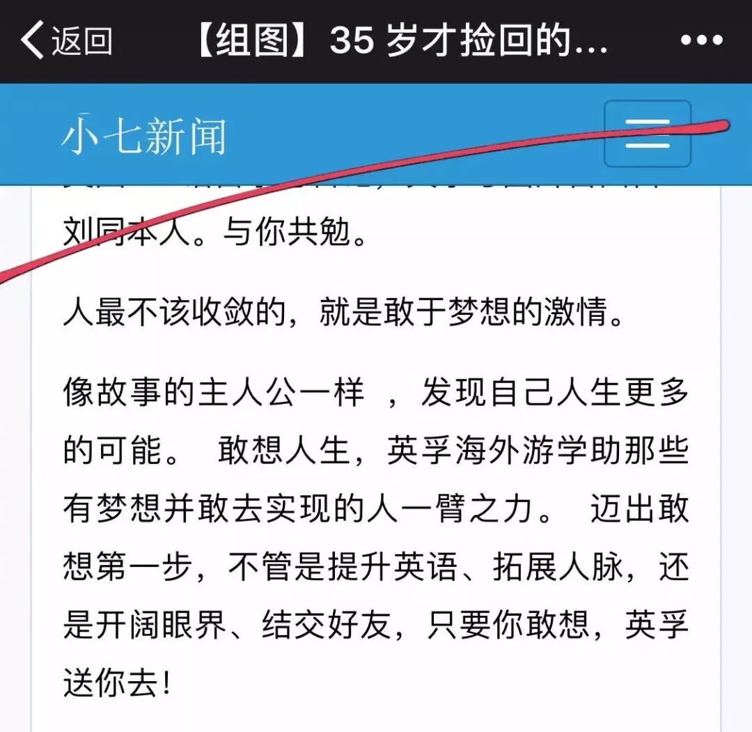 刘同说,让他愤怒的还有整篇文章的结尾处,多了这么一段“人最不该收敛的,就是敢于梦想的激情。像故事的主人公一样,发现自己人生更多的可能。敢想人生,英孚海外游学助那些有梦想并敢去实现的人一臂之力。迈出敢想第一步,不管是提升英语、拓展人脉,还是开阔眼界、结交好友,只要你敢想,英孚送你去!”然后底下是活动信息,奖品,一系列的广告……