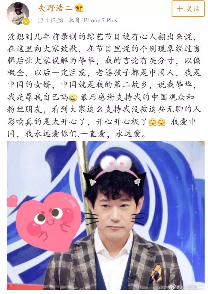 12月4日下午矢野浩二就此事在微博中道歉了,他承认自己言论有失分寸,以偏概全。他表示自己是中国女婿,老婆孩子都是中国人,中国是自己的第二故乡,辱华相当于在侮辱自己。