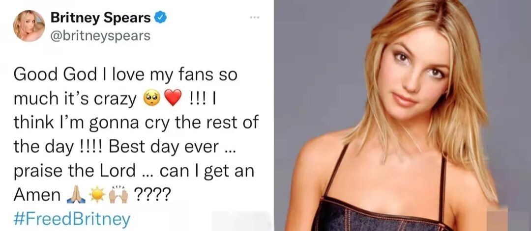 11月13日,美国天后布兰妮在个人社交平台上发布了一条视频,视频中粉丝正为布兰妮恢复自由所欢庆。布兰妮在文案中写到:“这是最好的一天”。据外媒报道,洛杉矶法官正式宣布布兰妮恢复自由,结束了长达14年的被监管生活。今后,布兰妮所有财产回归她自己所有,她可以自由地在医疗、财务和个人生活上做任何决定。