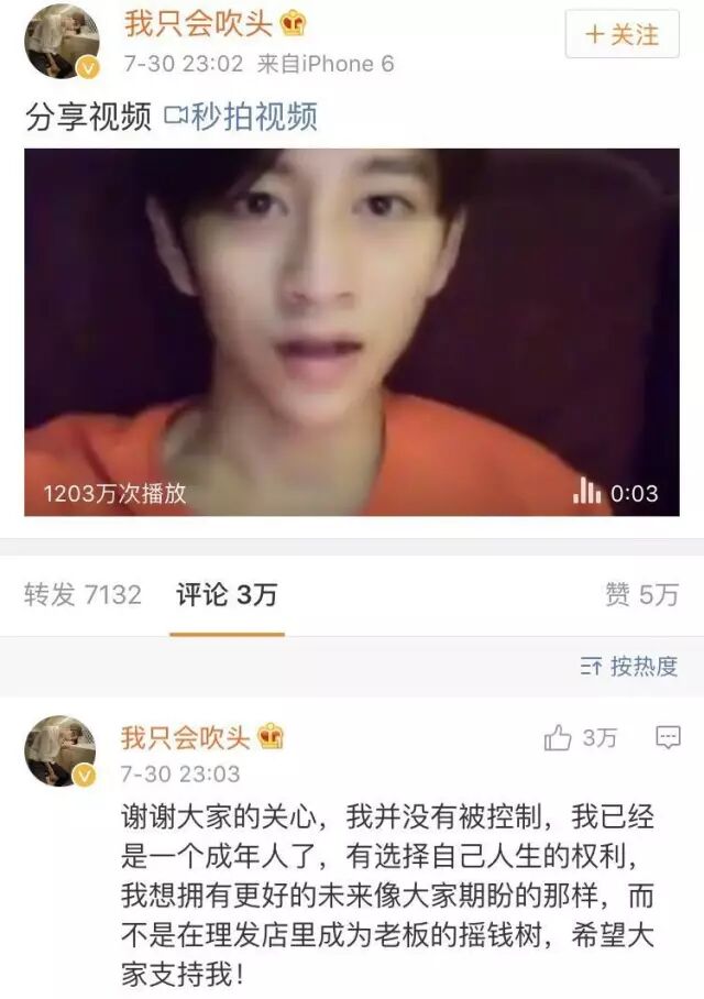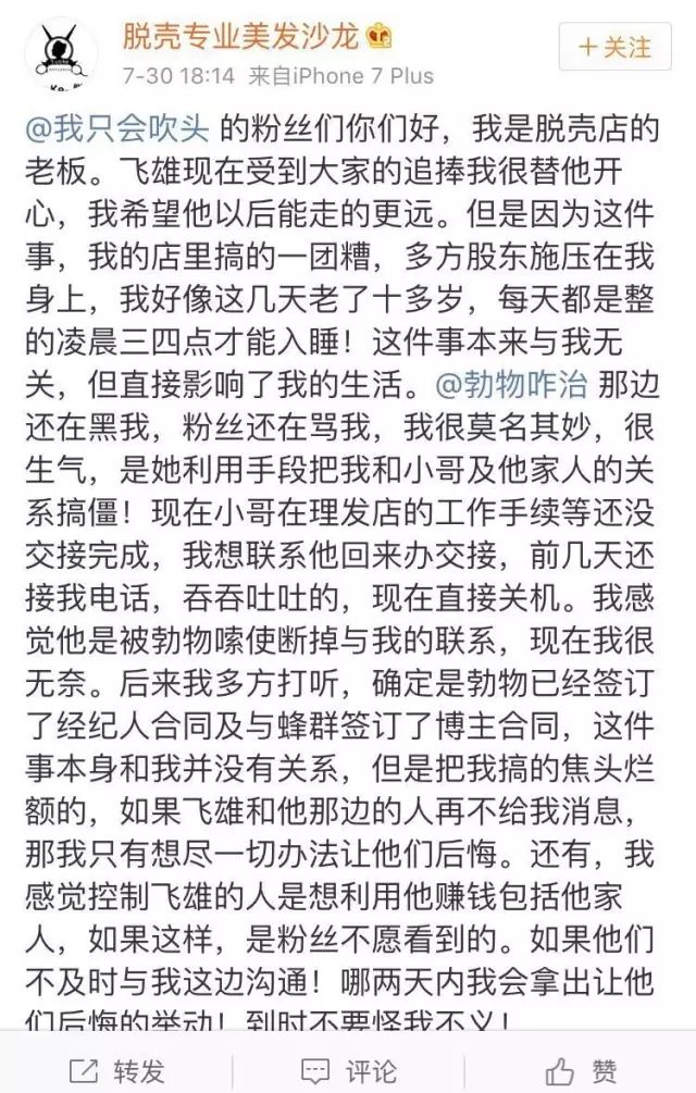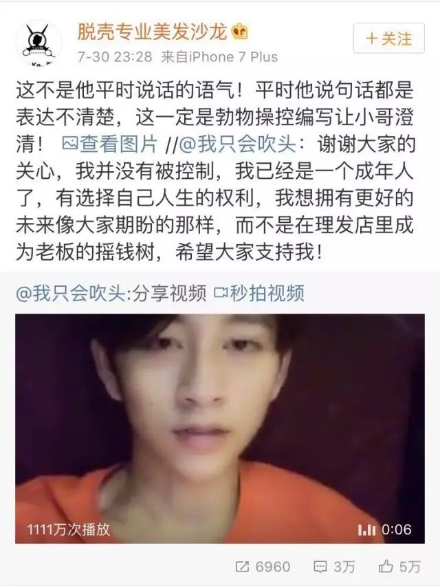 拥有一个微博粉丝上百万的号,是一个多么大的商机,狗血的事情随之而来,发掘小哥的那位博主,和理发店老板,为了吹头小哥互撕了!