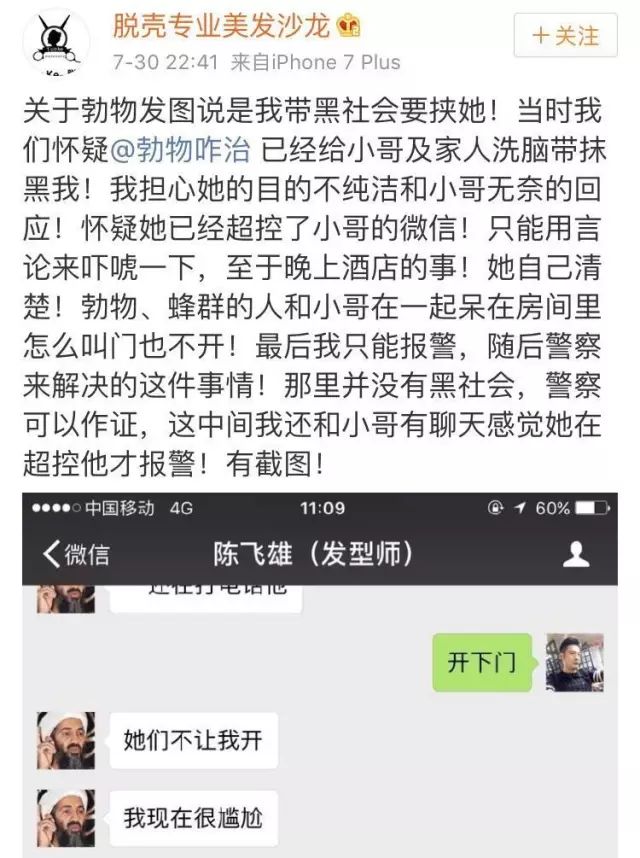 而理发店老板也有自己的一套说辞,说是博主从中作梗,把他和小哥及小哥家人的关系搞僵,工作手续还未交接完成,直接关机不见了,不得不出此下策,去酒店让他们开门,