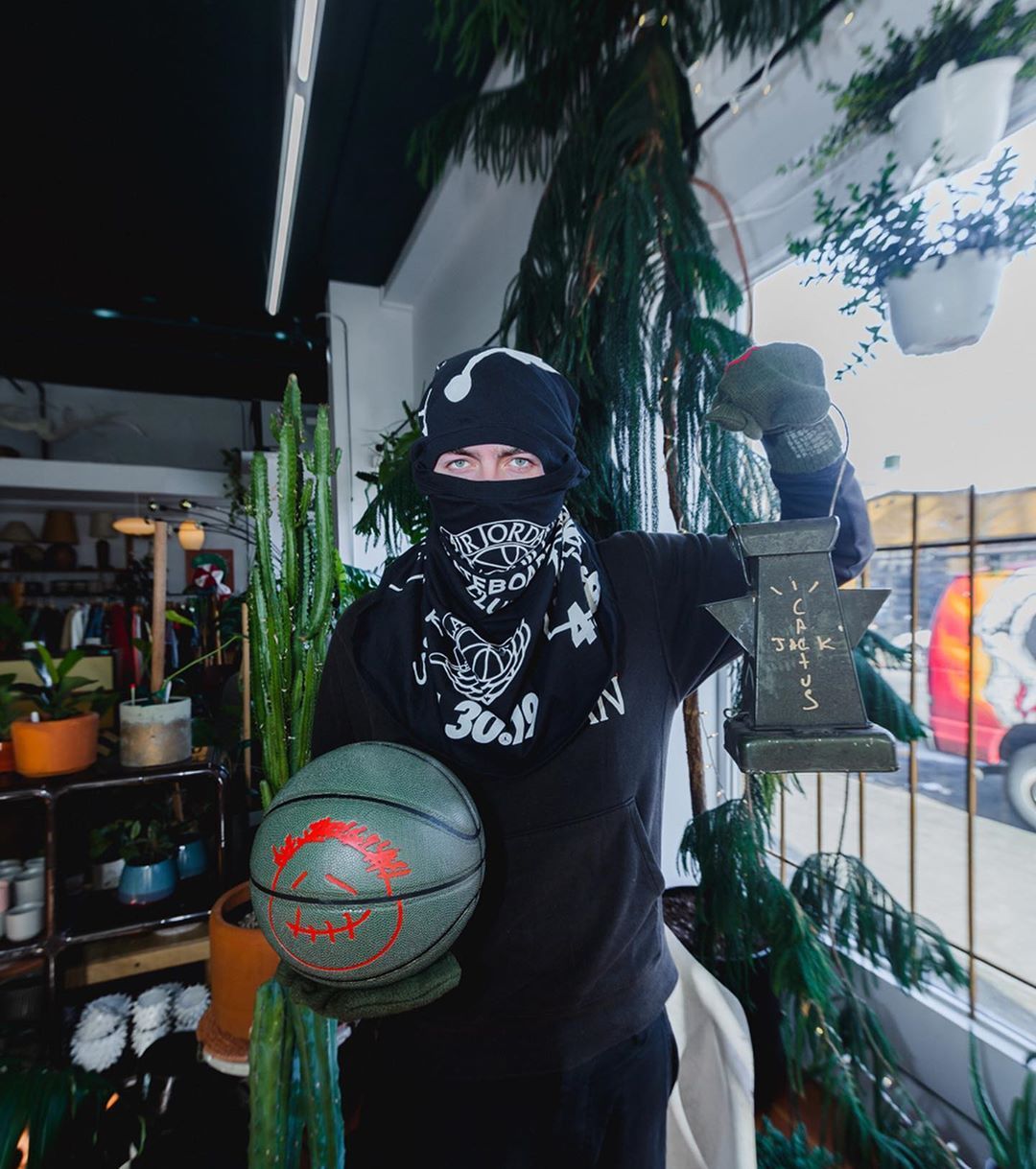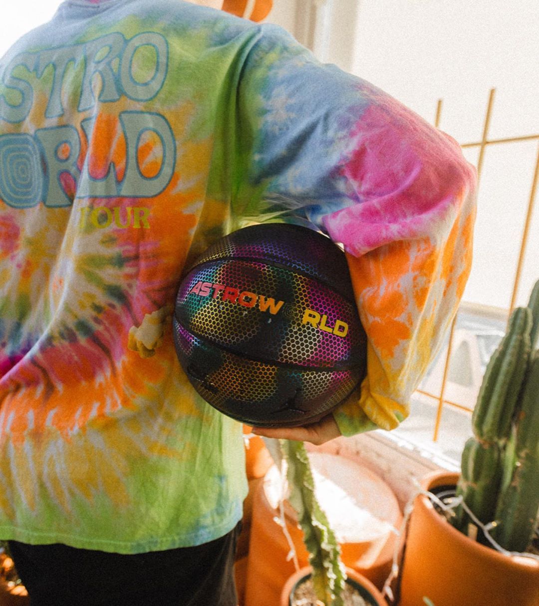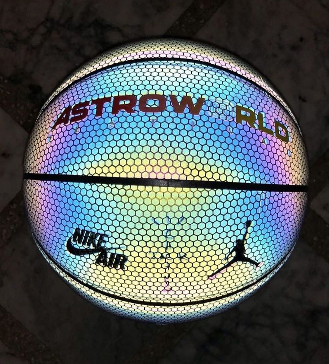它既是一款联名,却又像是 Travis Scott 操刀的一款艺术品,篮球表面覆盖了“发光皮革”,真是”好色”。