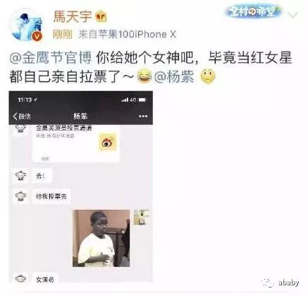 然后,马天宇发微博艾特金鹰节官微,要大家给杨紫投个女神,毕竟当红女星都自己亲自拉票了!不知道为什么就秒删了,网友纷纷感慨:笑死了!马天宇跟杨紫真是两个逗比。