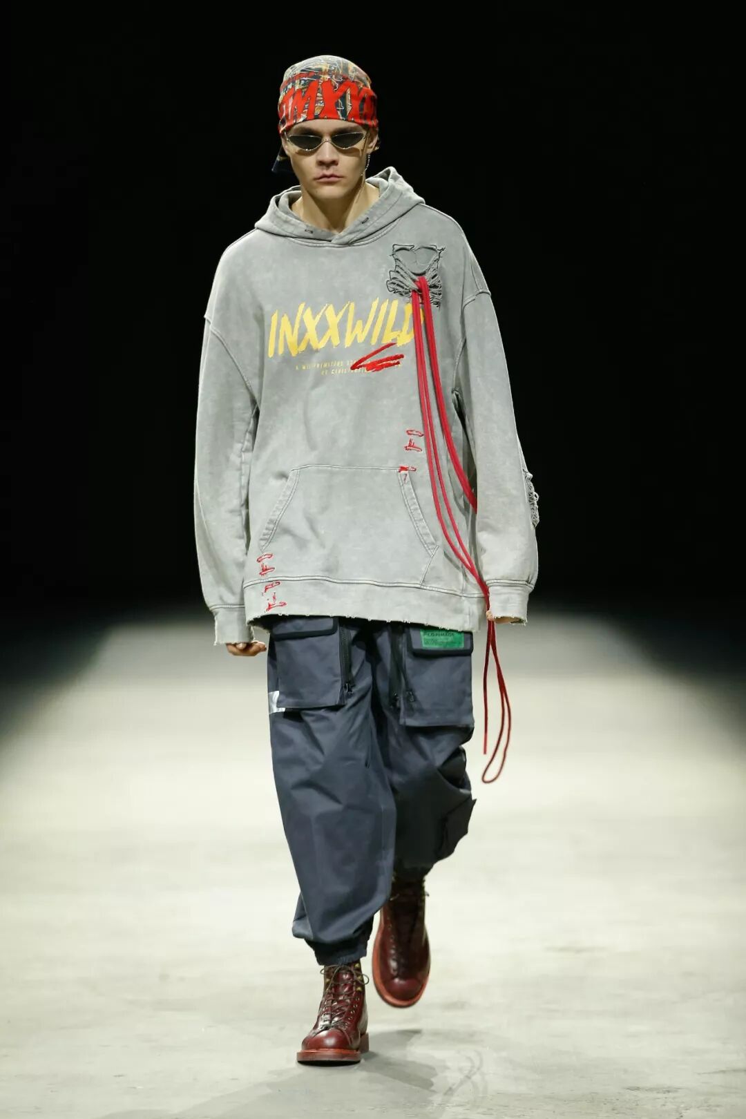 又得劳烦你们看看上方秀场图。迷彩裤就不用多说了,是在下的最爱,其中还有几款运用了拼接、解构,尤其是在膝盖部分特意撕开一道口,裤型和营造出的空间感一下就在模特的走秀当中显现出来了。当然,INXX 主线系列和以下单位的联名,也不得不让你们重视。