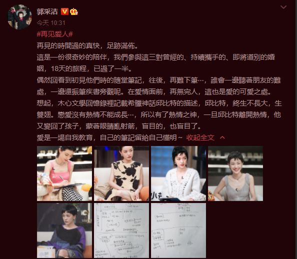 另一边郭采洁早上在微博晒出了节目《再见爱人》的随堂笔记,她说“爱是一场自我教育”,言辞之间对丘比特特别盲目,对恋爱也挺上头的感觉,令网友相当担心。