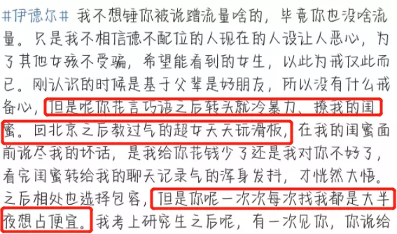 这位网友表示这次站出来揭发此事,只是希望其他女孩不再受骗。据该网友陈述,她和伊德尔是基于父辈是好友的情况下相识的,也因此她对这个人没啥戒心。然而两人交往之前男方甜言蜜语,确认关系后对方就开始冷暴力,而在有女友的前提下,还撩女方的闺蜜。