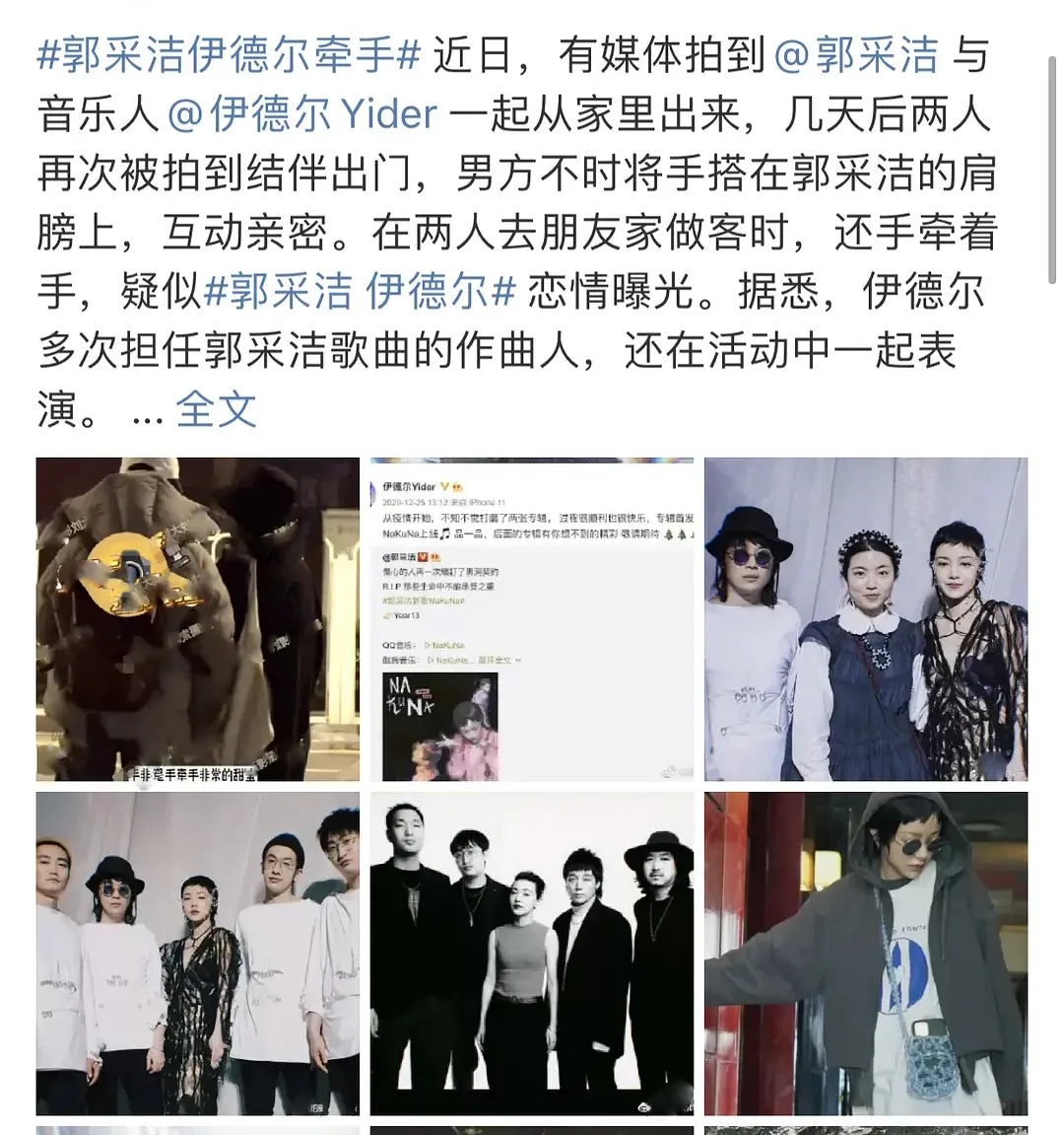 两人还共同参加了一档节目《一起乐队吧》,郭采洁作为导师,伊德尔是她团队内的一员,私下相处机会也多,两人被彼此相互吸引也不难理解。两人还被拍到一起现身机场。
