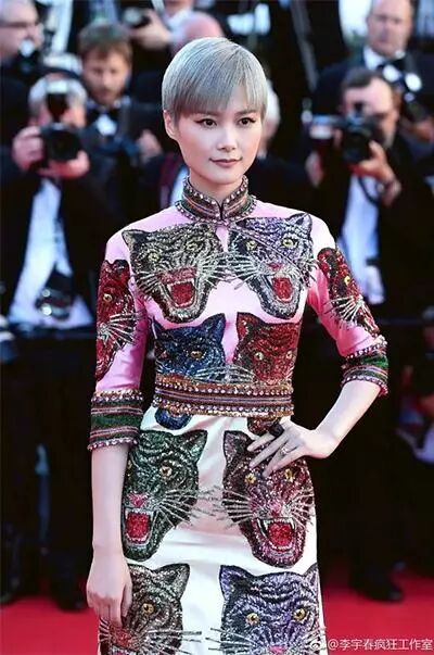 还有今年春春亮相戛纳电影节电影《玉子》的首映红毯时,她身着Gucci设计师为她特别定制的粉色及白色旗袍式拼接长裙,展现出性感浪漫,摩登优雅的迷人魅力。上身不仅没有艳俗感,还跟她本身的帅气调调中和的很完美。