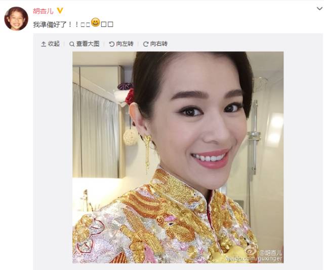 12月28号,今天是胡杏儿的大婚之日!胡杏儿和老公Philip Lee(李乘德)在香港Ritz Carlton酒店大婚,据说貌似只宴请二人亲戚好友筵开约50席。一早,待嫁新娘胡杏儿就在微博上po出新娘妆自拍照,并写道:我准备好啦。