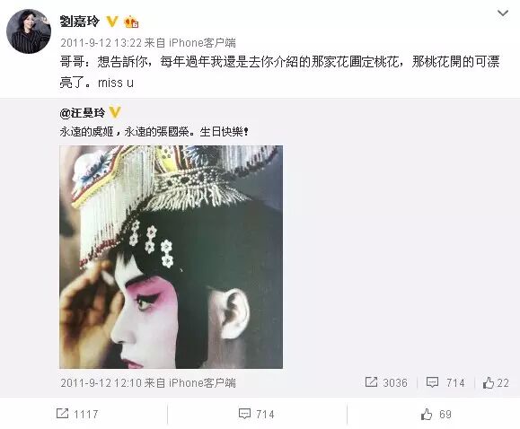刘嘉玲和张国荣有关桃花树的这个故事在2011年9月12日哥哥忌日时,刘嘉玲写的微博上得到印证:“哥哥,想告诉你,每年过年我还是去你介绍的那家花圃定桃花,那桃花开得可漂亮了。missu(想念你)”