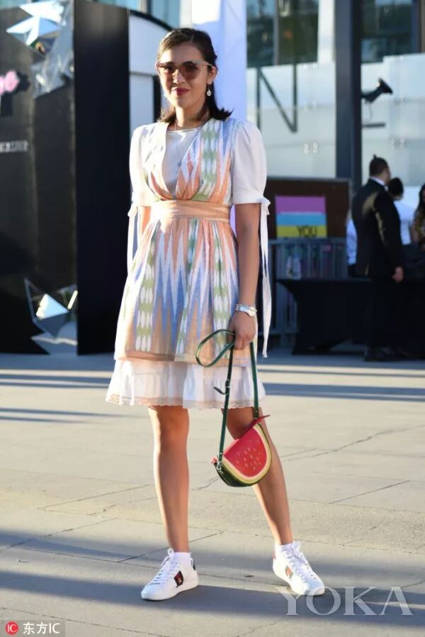 白色连衣裙搭上菠萝手袋更是潮趣十足。水果款包包的安全百搭风,这个时尚博主做了最强示范。
