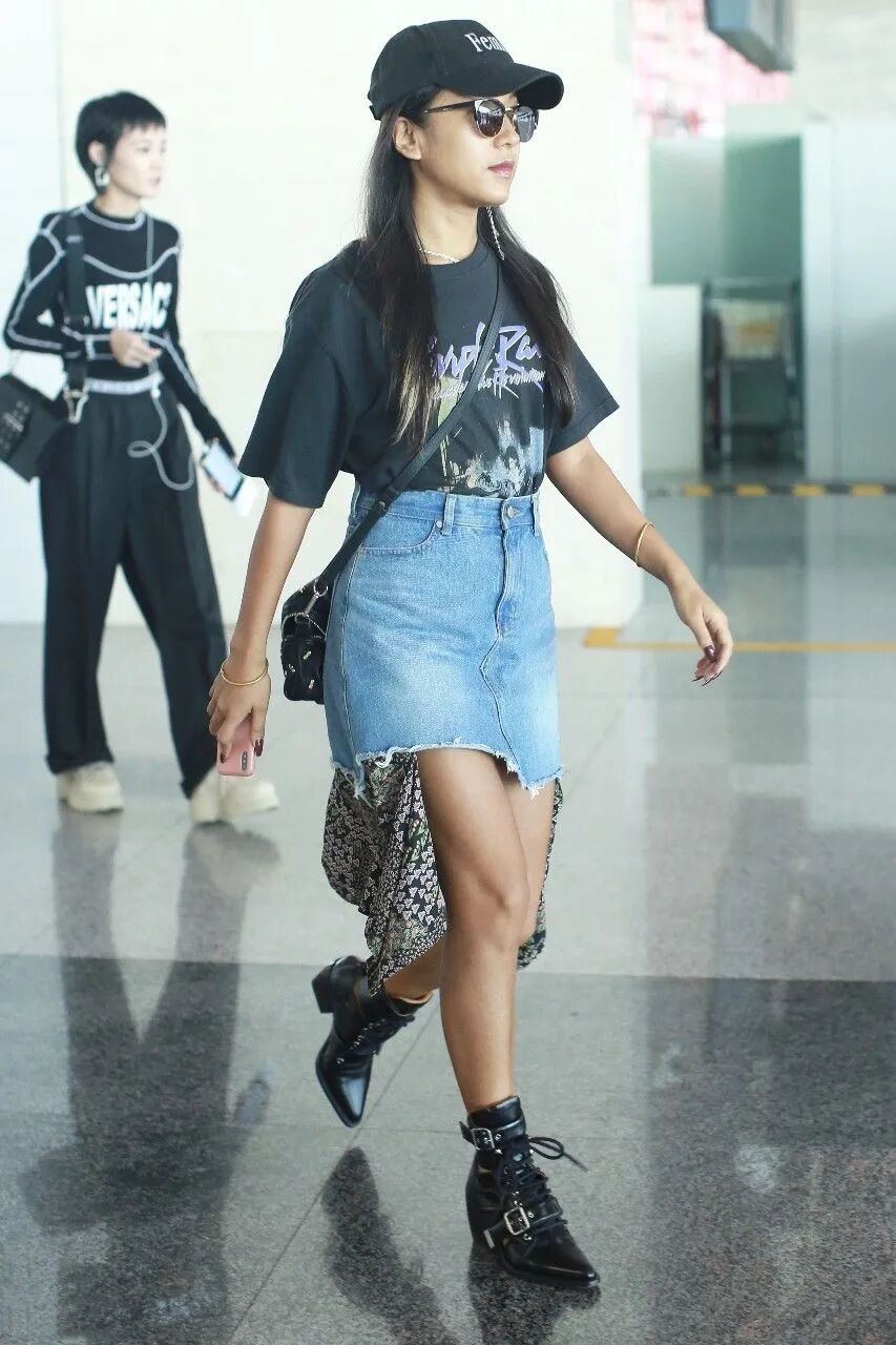 黑色的短袖配上一条牛仔的短裙的话也还挺不错的呀,有种非常青春的美感,而且这个角度的拍摄显得吉克隽逸的腿看起来倒还是挺细的,她长得本来就很美,还是要自信一点啊。
