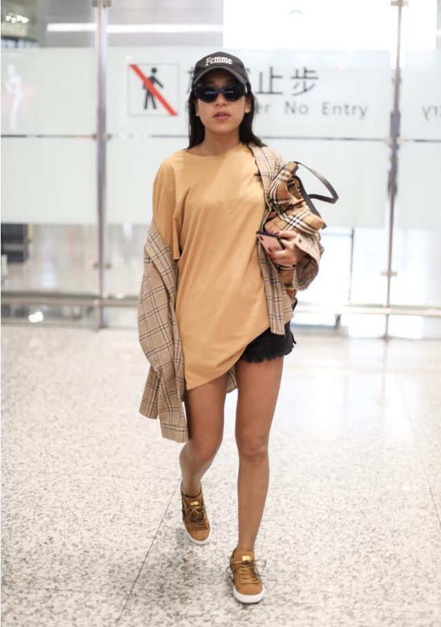 这样一件短袖其实还是很好看的,因为它的颜色非常的独特,外面套上一件格子的衬衫就比较的经典,而且这样的穿搭的话会显得她的腿看起来特别的直啊,那个腿型也不是那种很弯的了。