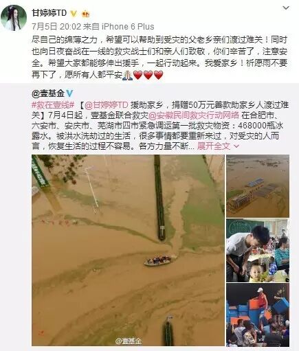 也不仅仅是赵薇一个人,同样作为芜湖人的甘婷婷,虽然名气上不如赵薇,黄晓明等大明星,但在这次家乡有难的时候,也个人捐献了50万呢!