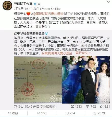 而在娱乐圈呢,明星在平时赶通告的同时,也肯定是要担负一些社会责任的!黄晓明Angelababy夫妇也是多次捐款捐献物资!