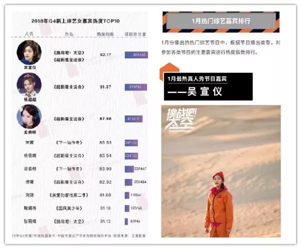 凭借这档综艺节目,吴宣仪拿下了2018年Q4新上综艺女嘉宾热度第一以及2019年1月份真人秀节目嘉宾网络热度指数第一。