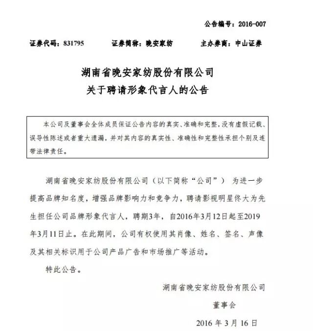 (图为晚安家纺关于聘请形象代言人的披露公告)