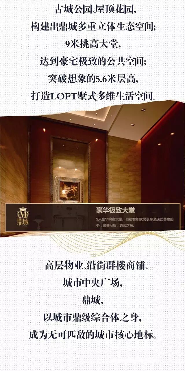 功能介绍:鼎城,人民南路城市综合体,拥有城市中极为稀缺的精装修单身公寓、以及高端人士专属的空中楼墅等物业类型。鼎城,以城市顶级综合体之身,成为无可匹敌的城市核心地标,树立精品至上的豪宅。销售热线0572-6878899