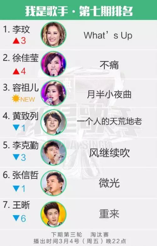 新浪娱乐讯 湖南卫视《我是歌手》第三轮竞演昨晚拉开序幕,李玟摇滚出击凭一首《What‘s Up》收入第三个周冠军,徐佳莹再度回暖,《不痛》摘得本场第二,补位歌手容祖儿“翻牌”好友金曲,首秀即入三甲占据季军宝座,黄致列则发挥苦情优势暂保安全,位列第四,而上周夺冠的王晰却爆冷垫底,让许多网友大跌眼镜。