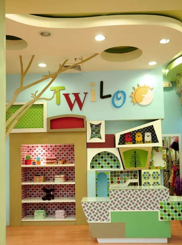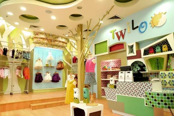 Twilo儿童服装专卖店的店铺设计,清新的色彩搭配让人如沐春风,树枝状的装饰充满童趣,能够吸引小孩子的目光。