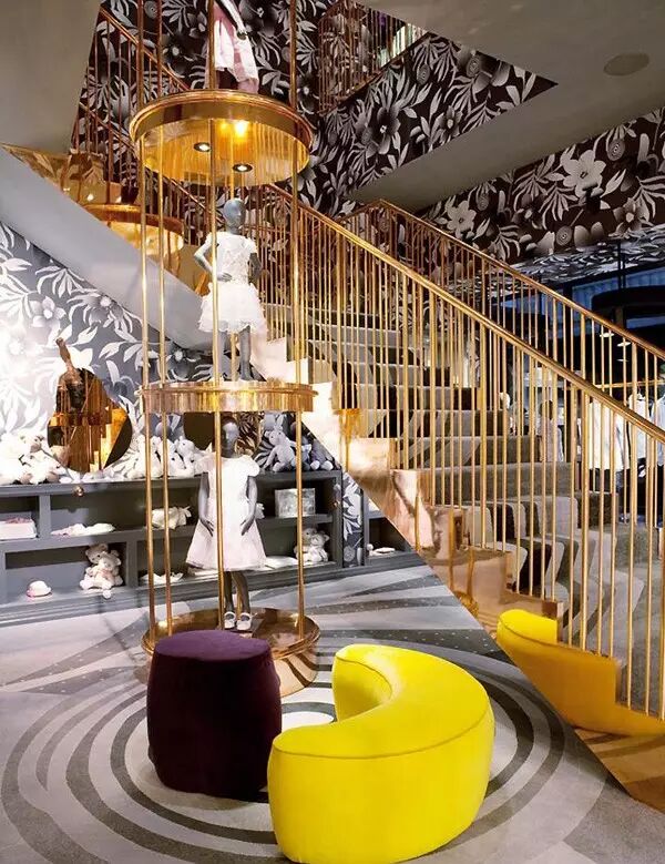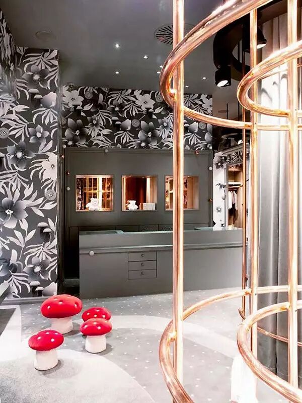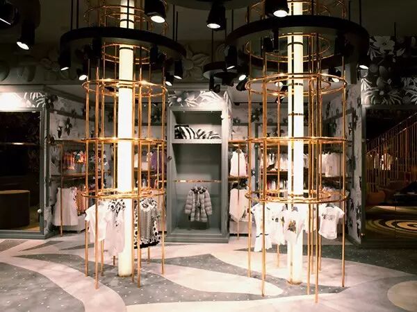店铺一共360平方米,主要以黑白二色为背景色,另外多层次的灰色极大丰富了空间感。闪闪发光的铜亚光在灰色和中性图案的背景上有一个令人兴奋和优雅的效果,整个空间看上去充满着童话般的气氛。
