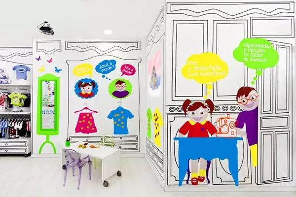 设计师深谙线条美术,仅仅只是用各式不同的线条配合简单的几何涂鸦就将童装店的趣味诠释得淋漓尽致,这样的店铺装修设计摈弃了过多华而不实的装饰,不仅能够大大降低装修成本,还能在众多童装店铺里脱颖而出。