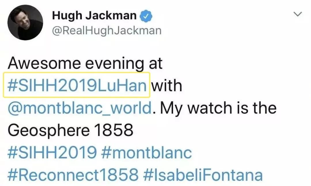 因为热度过高,连金刚狼休叔Hugh Jackman发推想选择#SIHH话题时,都不小心变成了#SIHH2019LuHan。