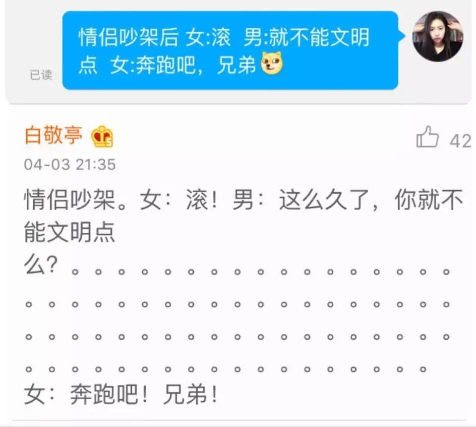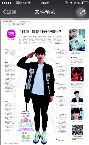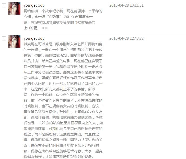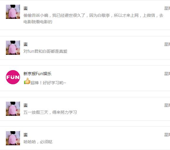 这位亲之前很认真的留言了很多参与“Fun娱乐迷粉店”的活动,之后自己失去了记录还一直在后台让我们发给她一份,想要珍藏自己对白敬亭的表白~这份感情,报报果断的翻了60多页记录一条条复制给了她,从此这位亲变成报报的脑残粉【希望这位可爱的粉丝不要打我…】好啦…反正就是特别活跃,在我编辑这篇稿件的时候这位亲还在后台打招呼…谢谢你在微博上给我们宣传,也谢谢你帮我们给其他粉丝解疑答惑…
