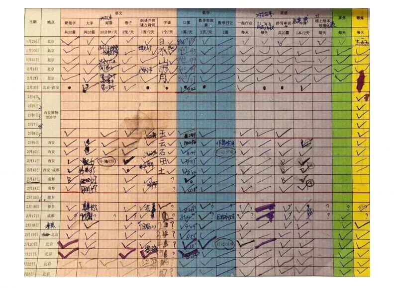 受锦华的影响,她七岁的儿子也已经有了很强的时间意识,独立上学,自主做假期49天计划表。