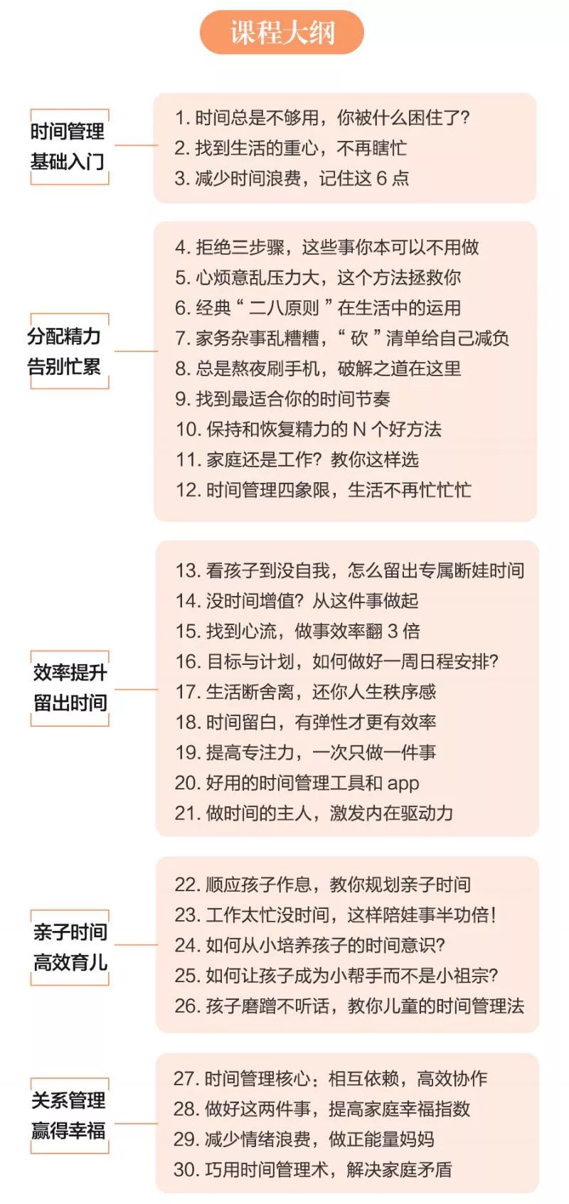 课程通过基础、效率、亲子、精力、关系,5大模块,循序渐进地带你认识时间管理。