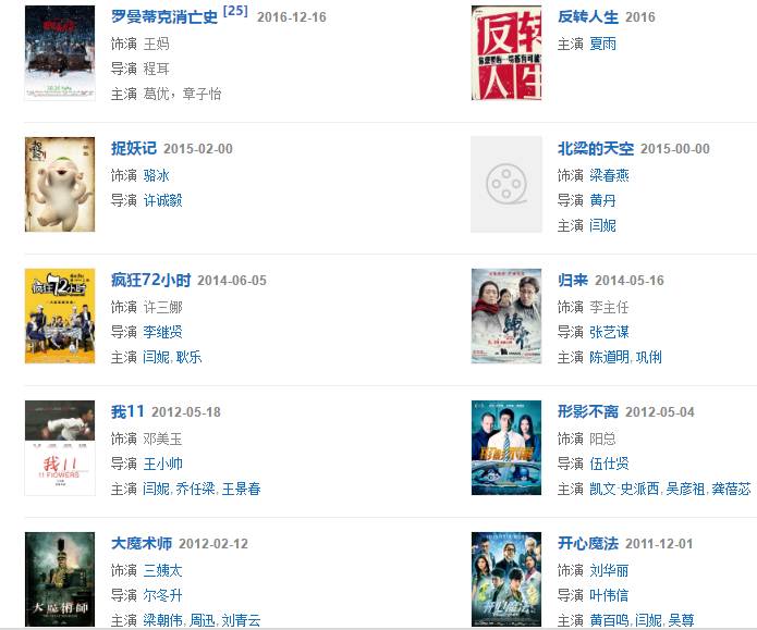 闫妮也曾花费几年工夫尝试拍摄了《三枪拍案惊奇》《画壁》《大魔术师》等电影。2016年,与夏雨再度合作,主演电影《反转人生》。