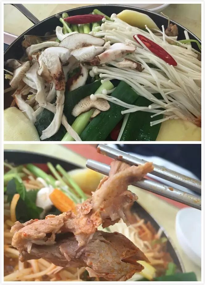 这个锅端上来后,就感觉到满满的诚意啊。微红汤底,最上面撒的是加香的调味粉。下面埋底的有土豆,没看见排骨,应该被盖住了,还有苏子叶,葱段。