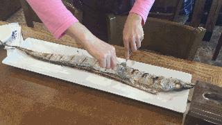 店员熟练的帮我们把带鱼去刺,方便我们食用