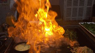 烤黑猪肉挺有形式感,烤到最后还会来这么“火上浇油”一把。别小看这一步,经过这一步,黑猪肉的外皮就比较脆,从而锁住了肉里面的汁水。