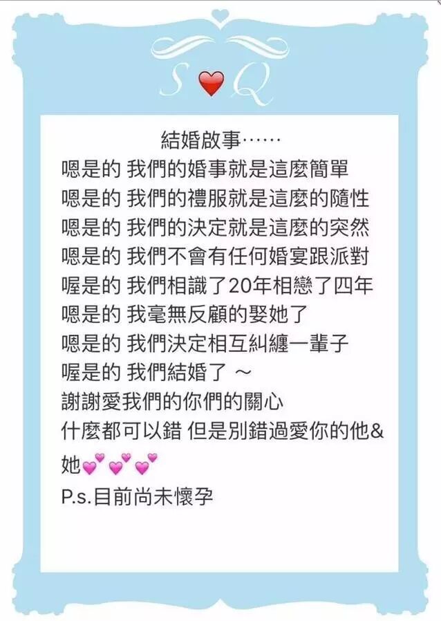 从宣布结婚到发布的《结婚启示》再到拍摄婚纱,舒淇和冯德伦公布恋情的方式实在是太突然,太随意了。