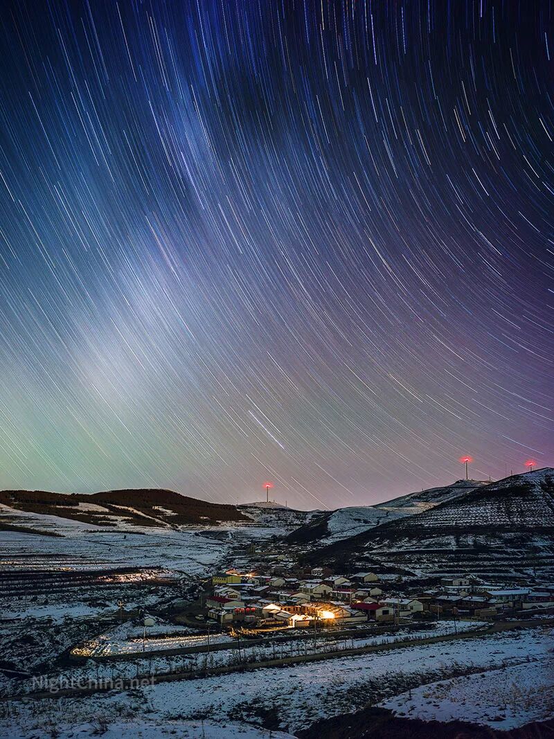 10月中旬,北方城市里还是盛秋之时,位于河北草原天路入口的桦皮岭驿站已经降下了今冬的初雪。风机下的小村庄在新雪的覆盖下入梦,夜空中是清澈的银河流转的轨迹。