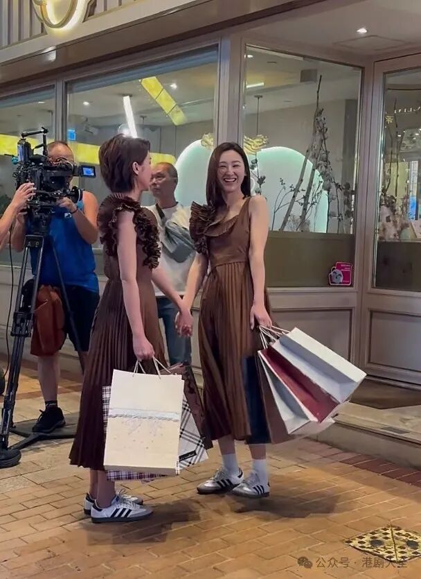 高海宁(右)与蒋祖曼拍摄剧集外景,以「姊妹装」上阵。