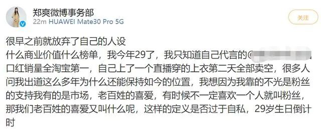 郑爽在社交平台上通过工作室的账号发文称自己很早就放弃人设了,直言自己能发展到今天靠的是老百姓的喜爱,"我靠的不光是粉丝的支持我有的是市场",引起网友热议。