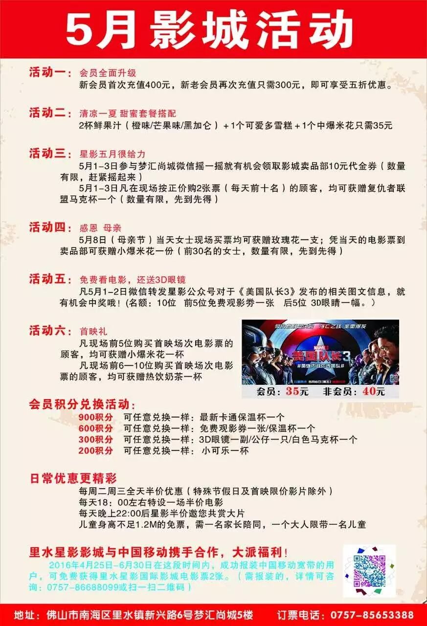 4月25日-6月30日,凡成功报装中国移动光宽带的用户,可免费获得里水星影国际影城电影票2张。