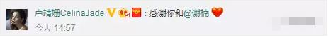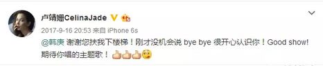 金鸡百花电影节结束之后,卢靖姗还专门发了个微博感谢了韩庚。