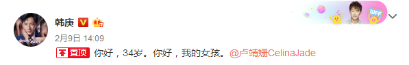 韩庚在2月9日也就是自己34岁生日的时候突然在微博说:“你好,34岁。你好,我的女孩卢靖姗。”正式公布了恋情。