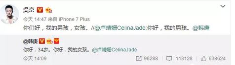 还有另一种说法是吴京和谢楠做媒。因为当时韩庚和卢靖姗公布恋情之后吴京转发了他们的微博还说:你们好,我的男孩,女孩。