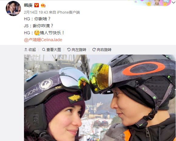 言归正传,公布恋情之后韩庚和卢靖姗就开启了撒狗粮之路,2月14日情人节又在微博晒出俩人甜蜜日常并附上了一张深情对视的照片。除了虐死单身汪,还是虐~