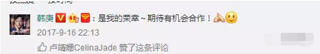 韩庚也随即出现在评论区表示是他的荣幸,还说期待有机会合作。值得注意的是当时卢靖姗还专门赞了韩庚的这条微博。韩庚和卢靖姗这个时候的互动可能就是为后来的相知相恋埋下了伏笔。