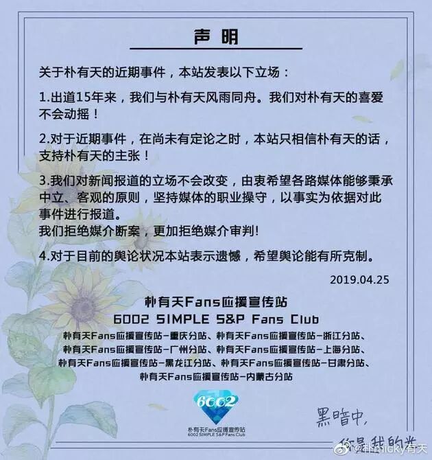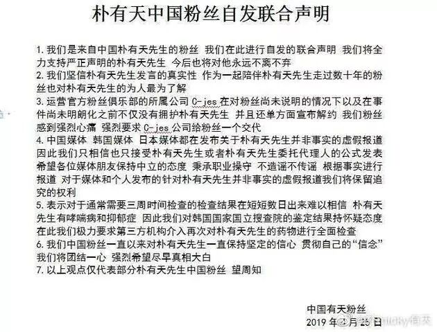 “对于近期事件,在尚未有定论之时,只相信朴有天的话,支持朴有天的主张!”