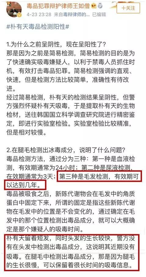 专业人士做出了解释:朴有天留着短发,同时头发的生长较快,警方没有在头发中检测出毒品成分,这说明其近期没有吸毒。在腿毛中检测出毒品成分,那是因为腿毛的生长很慢,可以保留着很长时间的吸毒信息。