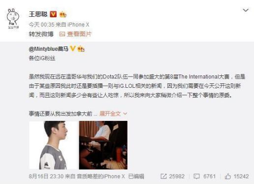 7年前IG战队的前身CCM战队还只是一只苟延残喘在电竞圈的三流战队,一度传出将要解散。同年,娱乐圈纪委王思聪微博高调声称“强势进入 整合电竞”。