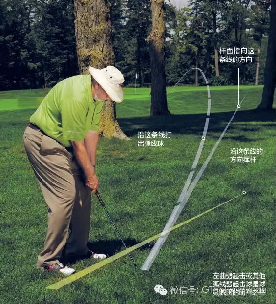 如果你需要打出比这个更大的弧度,瞄准(和挥杆)更向右一些,同时更多地闭合杆面。